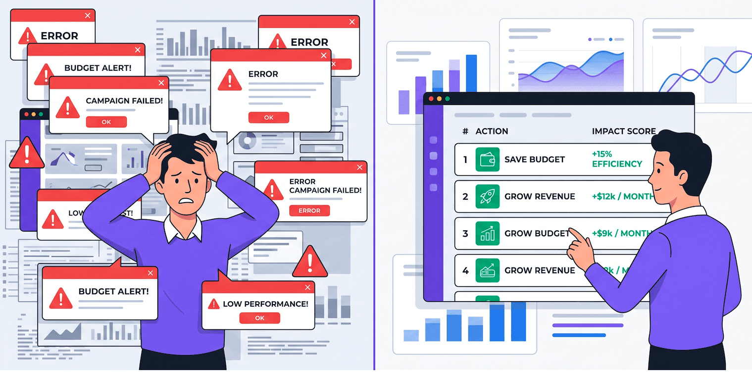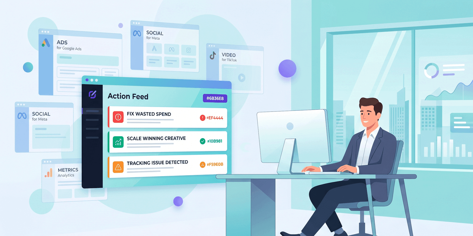 Ask questions like ‘Why did ROAS drop this week?’ or ‘What should I fix today?’ and get clear answers plus suggested actions.